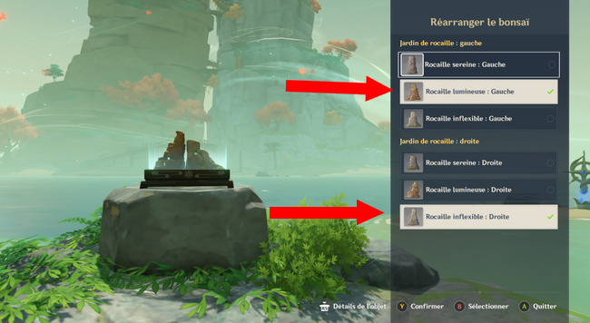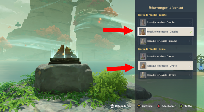 Après la scène, allez à nouveau sur l’île du bonsaï pour Réarranger le bonsaï. Choisissez « Rocaille lumineuse : Gauche » et « Rocaille inflexible : Droite ».