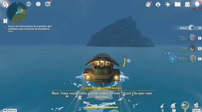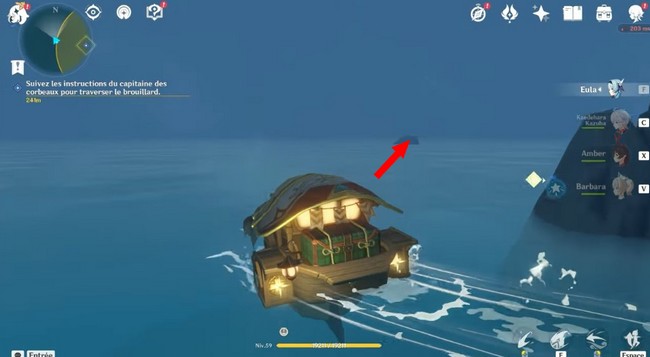 Montez à bord de la barge et dirigez-vous vers le nord à partir de l’emplacement actuel et passez à travers les rochers selon un schéma donné pour trouver l’île de la brume.