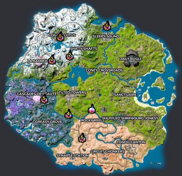 Avant d’aller plus loin, il est essentiel de savoir où vous pouvez trouver des cosses de gaine de réalité, surtout si vous êtes un débutant. Auparavant, les cosses de gaine de réalité se trouvaient aux cascades de réalité et Greasy Grove. Au moment où nous écrivons ces lignes, vous pouvez les trouver dans les endroits suivants de Fortnite :