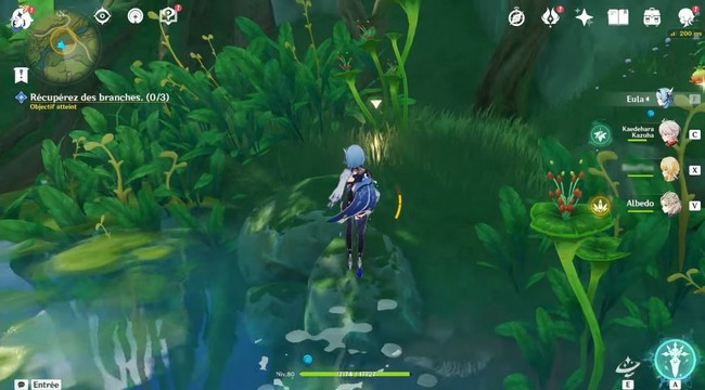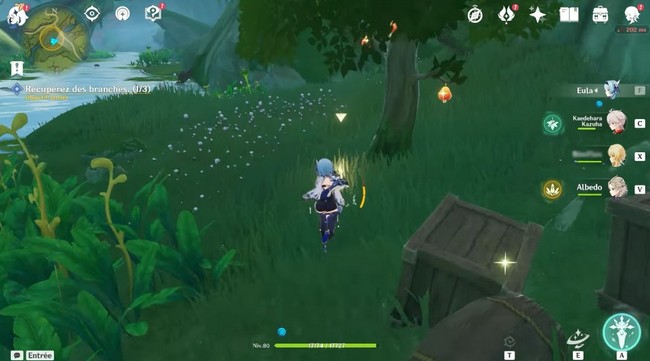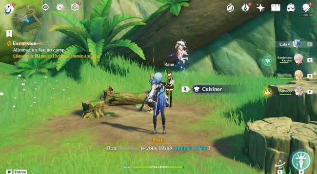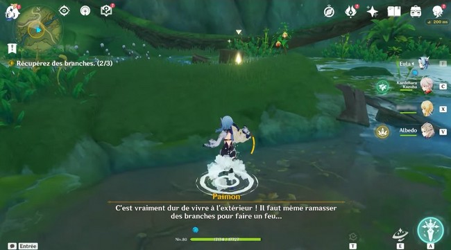 Dès que vous arriverez au camp, Rana ira l’équiper. Paimon se portera volontaire pour l’aider et recevra une tâche – récupérez 3 branches. Des branches sèches peuvent être trouvées près des buissons et des arbres.de l’autre côté de la rivière. Total requis 3 unités de bois de broussailles.