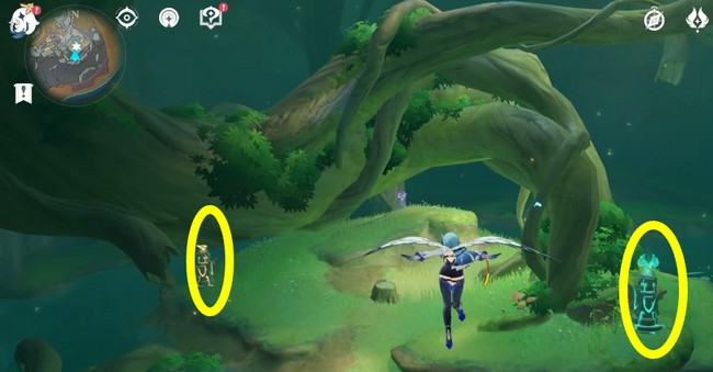 Vous devrez marcher tout le long jusqu’à ce que vous voyiez ces 2 totems l’un autour de l’autre. Vous pouvez les activer en vous changeant en Raiden Shogun, Zhongli, et Xiao. Frappez les totems et le coffre apparaîtra au milieu d’eux.