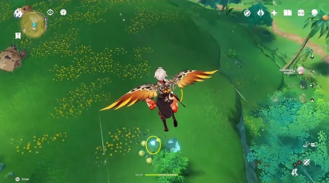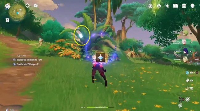 Dans la zone marquée de cercles jaunes, appuyez sur « Z » pour utiliser « Fée chercheuse ». Lorsque vous invoquez « Fée chercheuse », vous pouvez voir l’emplacement du prochain fée sur la mini-carte. La première fée se trouve au nord du point de téléportation. Allez à cette fée, puis suivez la fée à deux endroits différents (3 au total) jusqu’à ce qu’elle ait localisé un trésor dans la zone indiquée par une lumière blanche.