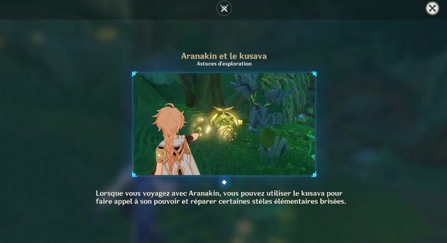 Lorsque vous voyagez avec Aranakin, vous pouvez utiliser le Kusava pour faire appel à son pouvoir et réparer certaines stèles élémentaires brisées. Vous obtiendrez le sucées « L’amer fruit des rêves ».