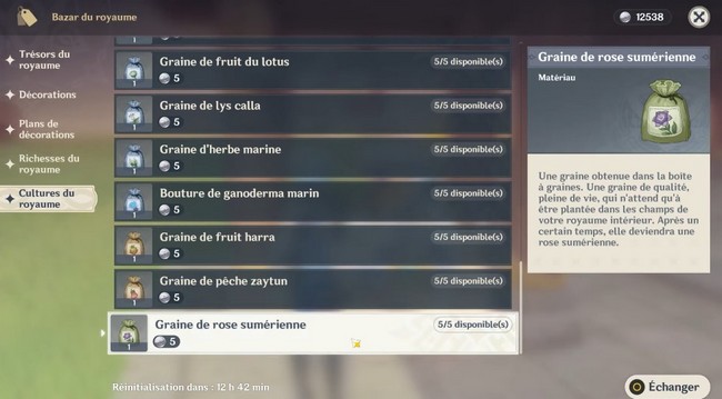 Votre prochain objectif est d’obtenir des graines de rose Sumérienne. La façon la plus simple de le faire est de l’acheter chez Taby dans votre sérénithéière. Un sac coûte 5 devises du royaume.