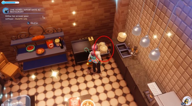 Après avoir été téléporté au restaurant, parlez à Rémy pour commencer sa quête. Il vous donnera l’objectif de nettoyer 3 assiettes sales.