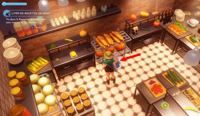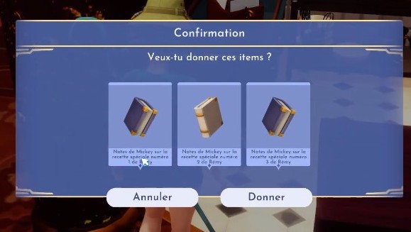 Vous commencez la quête en parlant avec Rémy qui a oublié la plupart de ses recettes. Après cela, trouvez et parlez à Mickey qui vous donnera une liste d’indices de livre indiquant où se trouvent les recettes.