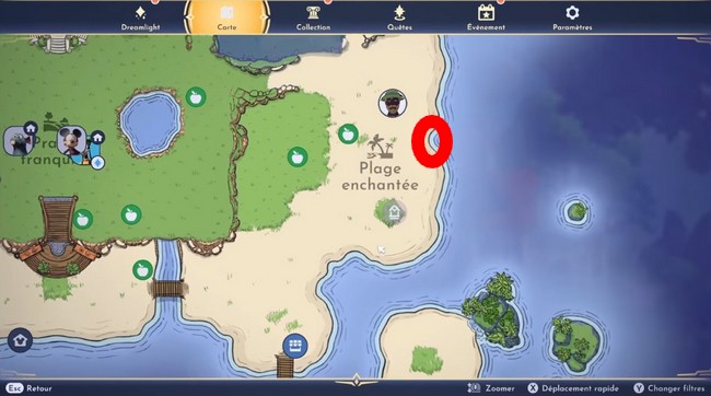 Enfin, vous aurez besoin de l’Eau de l’océan, alors allez du côté est de la Plage Enchantée, près de la fontaine de voyage rapide. Consultez la carte suivante pour connaître l’emplacement exact.