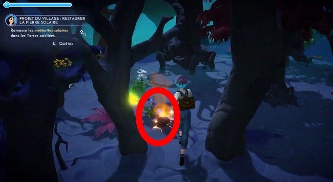 Vous trouverez les météorites éparpillées dans la région des Terres oubliées. Elles ressemblent à de petits rochers d’où sort une fumée orange, comme celle de l’image ci-dessous.