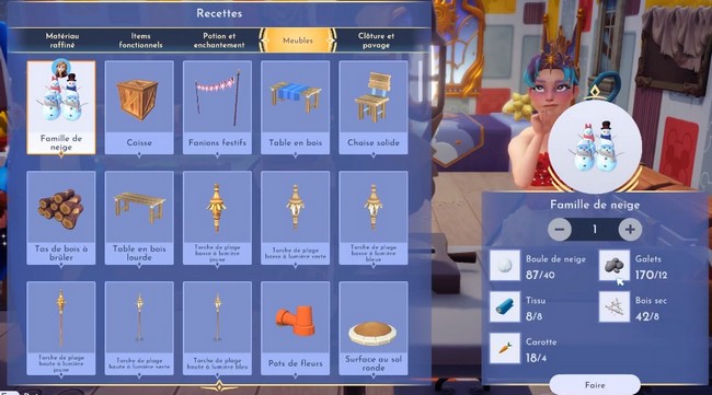Interagissez avec la station, allez dans l’onglet Meubles, sélectionnez l’icône Famille de neige et appuyez sur le bouton Faire dans le coin inférieur droit.