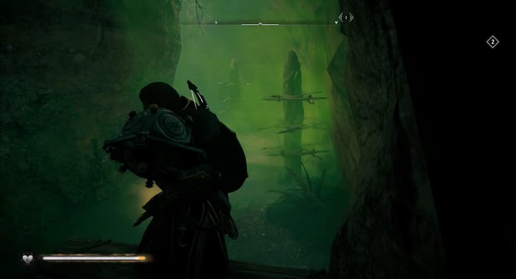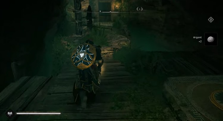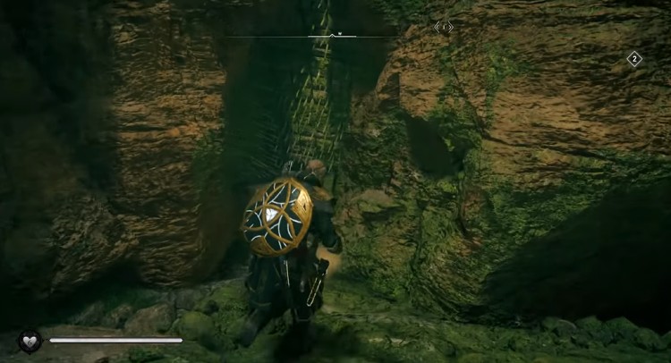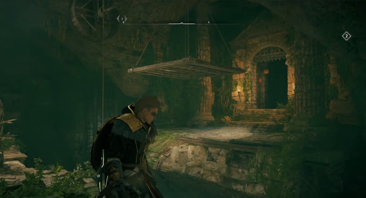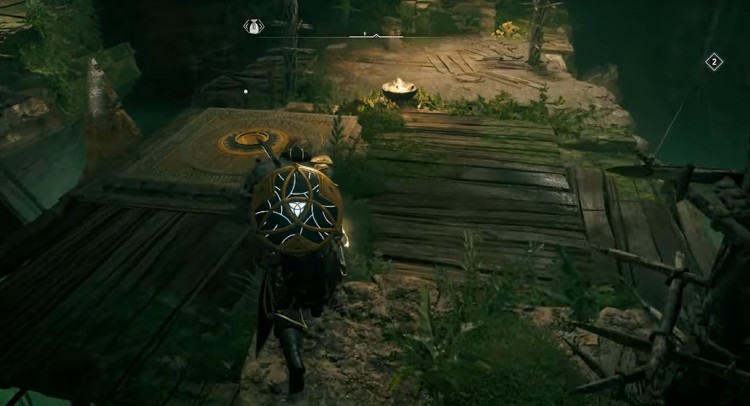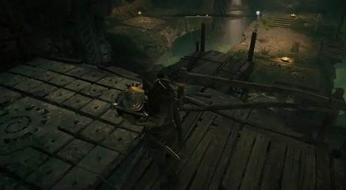 Continuez à suivre le couloir étroit. Vous devrez glisser à travers une fissure dans le mur de pierre, courir sur des pics carrés au sol et traverser un trou géant en sautant du rebord pour vous accrocher à une structure en bois de l’autre côté. Enfin, passez par l’étroite fissure dans le mur pour entrer dans la grande salle avec les énigmes.