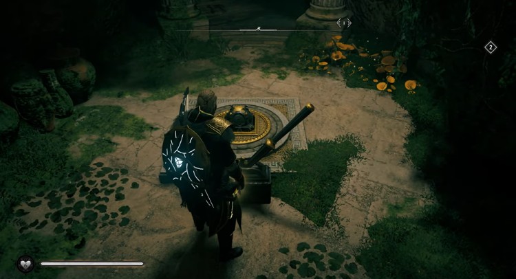 Tournez-vous vers votre gauche pour commencer le premier puzzle d’objets. Vous devez trouver un pylône de forme carrée ressemblant à un obélisque et le déplacer vers le carré doré illustré dans l’image ci-dessous.