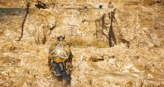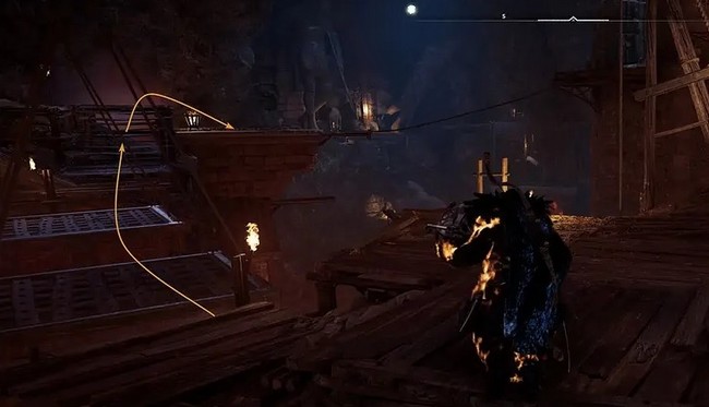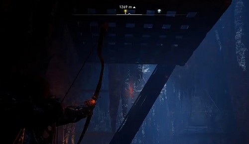 Glissez ensuite dans la fente étroite du mur de pierre suivant et descendez. Une fois encore, vous devrez contourner les pointes verticales et autres obstacles pour éviter de vous blesser. Au bout, regardez en haut, tirez votre flèche et frappez la plate-forme en bois pour faire tomber la structure, puis montez dessus.