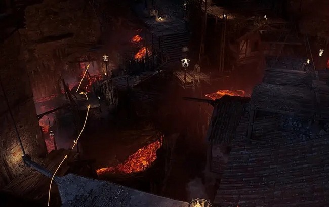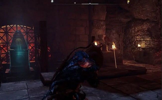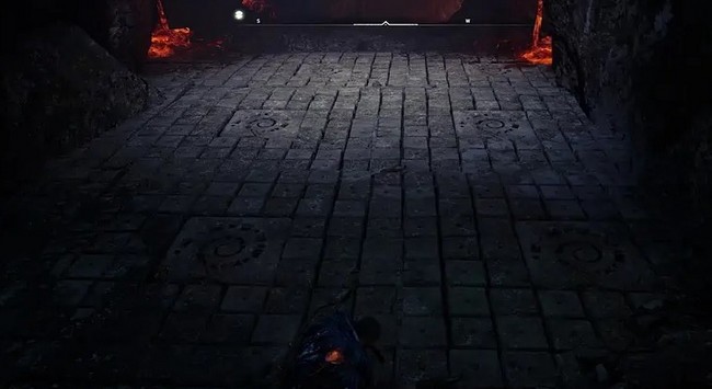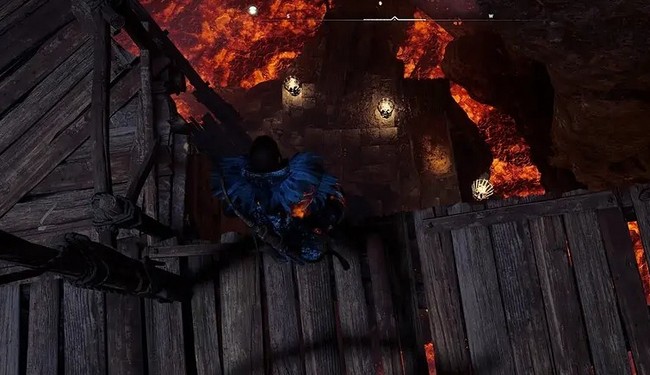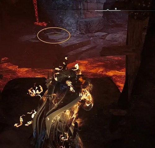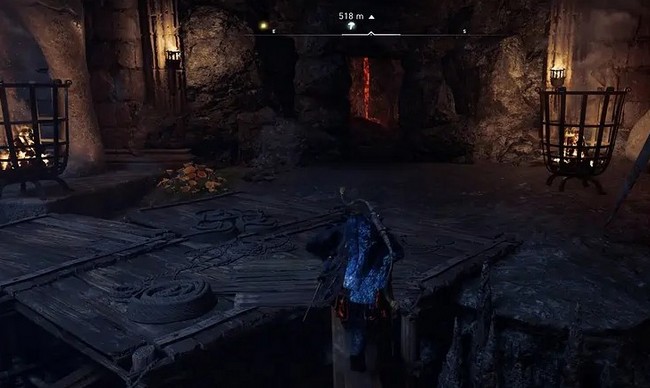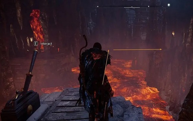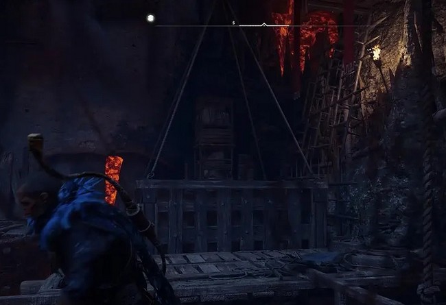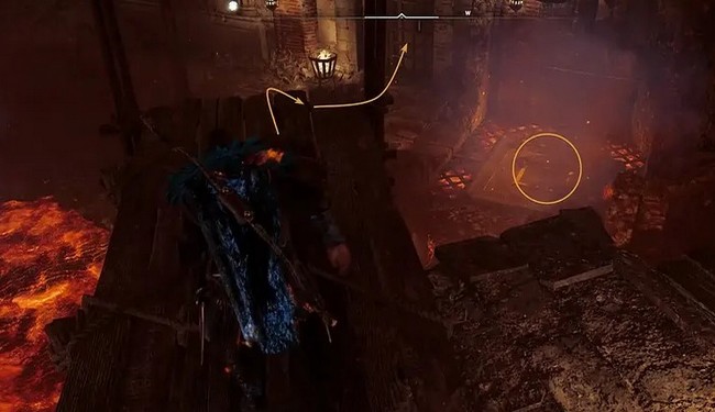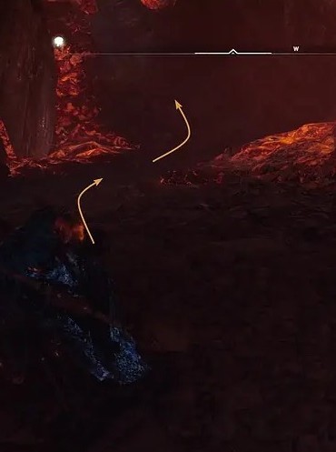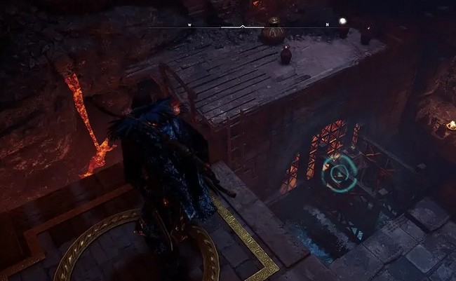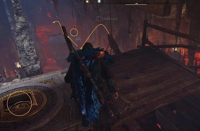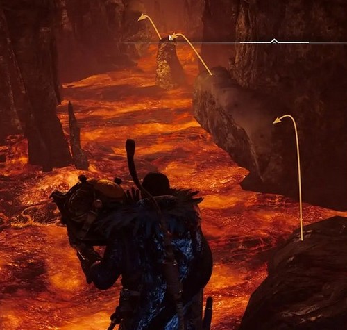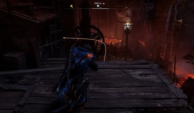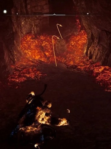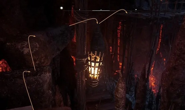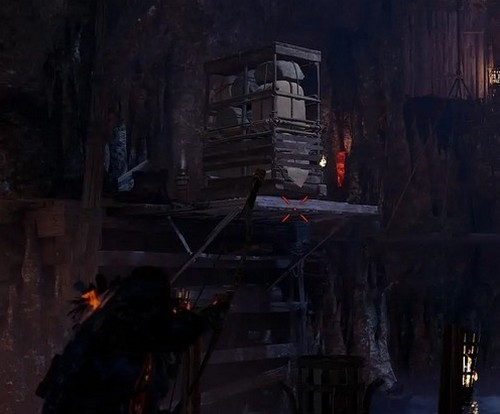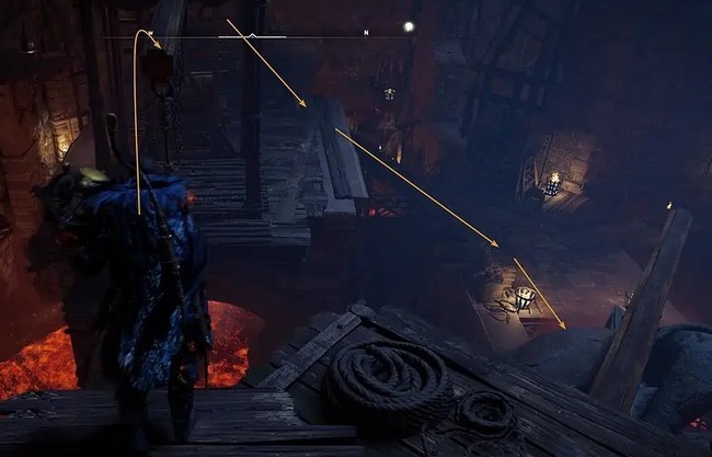 Grimpez jusqu’au sommet. Brisez le faible mur en bois, tirez le levier sur votre gauche pour commencer à déplacer la plateforme au-dessus du bassin de lave et suivez le chemin jusqu’à l’autre extrémité. Utiliser une flèche incendiaire pour faire exploser le mur de pierre.