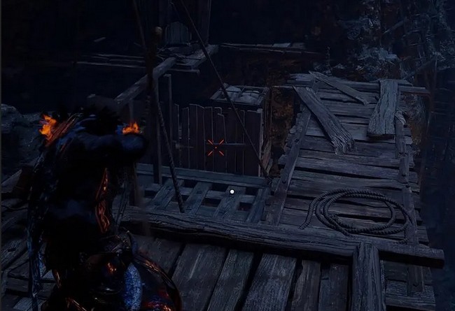 Dans la pièce suivante, fais exploser le mur de pierre. Vous pouvez utiliser une flèche incendiaire ou casser la plate-forme en bois au-dessus du mur de pierre pour faire tomber et exploser les vases.
