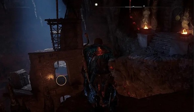 Interagissez avec le levier sur la gauche. La plateforme va commencer à s’élever. Grimpez dessus. Sautez de l’autre côté ici (image ci-dessous). Si vous avez des flèches incendiaires, sautez cette étape. A droite de l’obélisque, il y a un mur de pierre. Fais-le exploser.