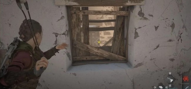 Là-haut, vous verrez une petite fenêtre où vous pourrez tirer sur la porte pour la rendre accessible. Visez la poignée de la porte et lancez-y une pierre.
