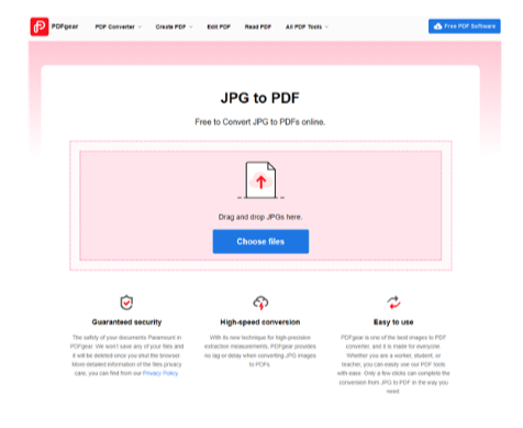 PDFgear transformera rapidement vos images JPG en fichiers PDF et vous donnera la possibilité de les télécharger en haute définition et sans filigrane. PDFgear est un outil en ligne basé sur le cloud qui est compatible et fonctionne avec tous les systèmes et appareils, y compris Windows, Mac et Linux. Aucune inscription ni adresse électronique ne sont requises.