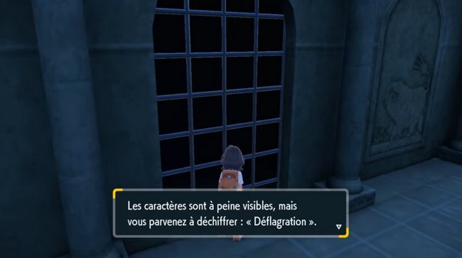 Descendez les escaliers fermés et interagissez avec la porte sombre pour voir qu’il y a une légère écriture qui dit “Déflagration”.