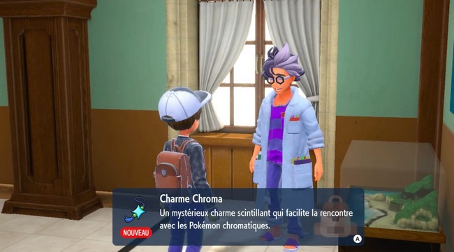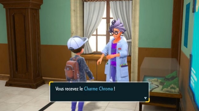 Une fois que vous avez rempli le Pokédex de Paldea, allez voir votre professeur Jacq, et il vous donnera le Charme Chroma. Vous pouvez trouver le Professeur Jacq dans la salle de biologie de l’Académie.
