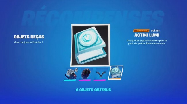 Pour terminer les quêtes D’Actini Lumi de Fortnite, vous devez accomplir des objectifs bonus du jour. C’est à dire, que vous devez relever des quêtes quotidiennes. Une fois terminé, vous allez gagner les 1000 V-bucks + La tenue Actini Lumi + L’accessoire de dos Cuirasse strass + La pioche Visqueuses radieuses.
