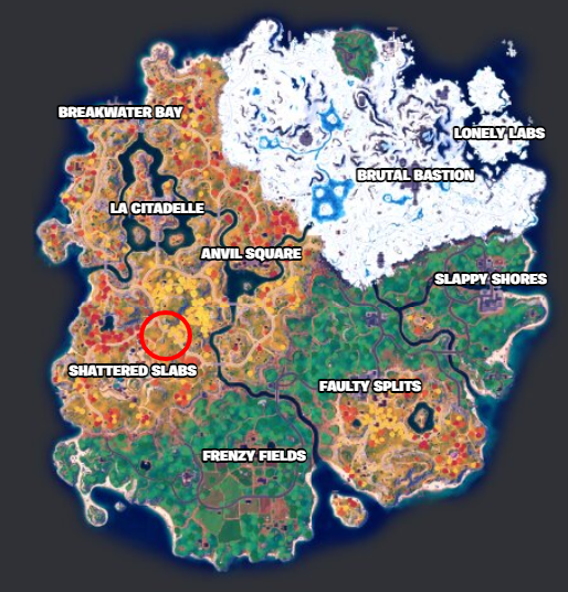 Pour compléter ce défis, vous devez tout d’abord trouver un tas de feuille. Pour cela, vous devez se rendre à Shattered Slabs, l’endroit exacte est indiqué sur la carte ci-dessous :