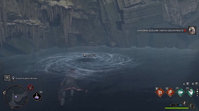 Dans la pièce suivante, battez les fangieux puis sautez dans l’eau derrière eux. Cherchez l’endroit où l’eau bouillonne et plongez dedans. Vous serez transporté dans un autre endroit.