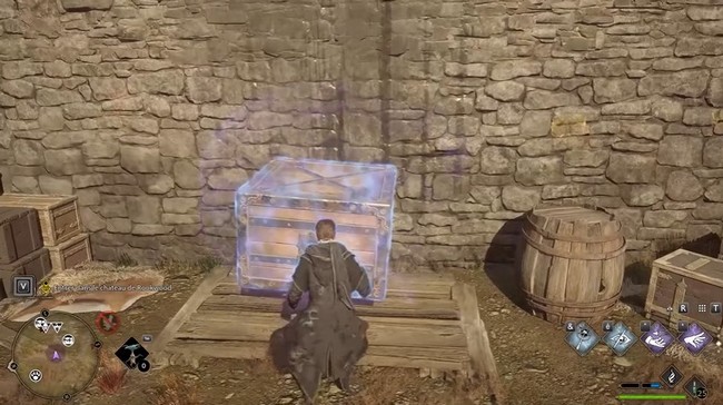 Pour entrer dans le château, il y a un trou sur le mur. Utilisez Wingardium Leviosa pour déplacer la caisse et grimper dessus.