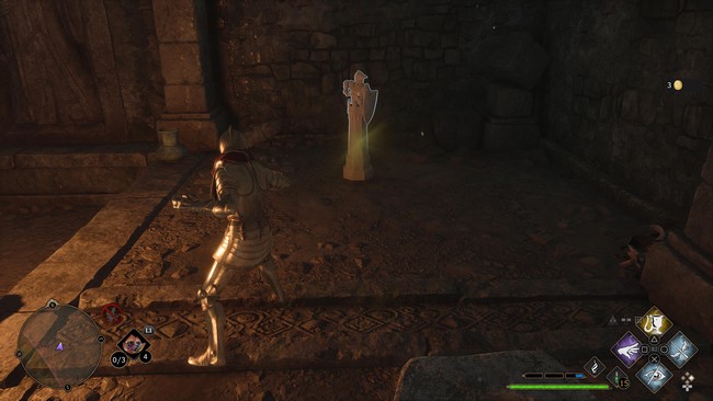 Suivez le chemin qui descend dans la chambre forte. Une fois à l’intérieur, vous verrez un jeu d’échecs gravé dans le sol en pierre avec plusieurs pièces disposées. Remarquez que vous ne pouvez déplacer aucune des pièces.