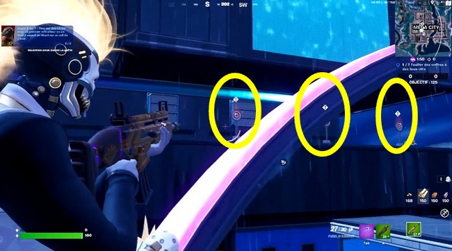 Pour ce défi, vous devez tirer sur des cibles avec un pistolet-mitrailleur ou un fusil d’assaut. Comme vous devez de toute façon vous rendre à Méga City pour utiliser les rails de glisse, nous vous recommandons de fouiller les coffres à cet endroit pour trouver le bon pistolet.