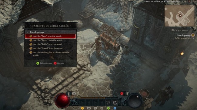 C’est assez simple, tout ce que vous avez à faire est de vous diriger vers la Tablette de cédre sacrée qui se trouvent juste au-dessus de vous et d’y inscrire votre péché le plus notable. Vous aurez le choix entre les options suivantes : Fear, Anger, Pride, Greed, ou scribbles. Comme l’a dit Lorath Nahr, cela n’a aucun sens. Choisissez l’option qui vous convient le mieux et vous obtiendrez le droit de vous rendre à Kyovashad.