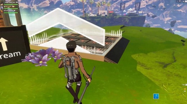Dirigez-vous vers la rampe de saut dans l’image ci-dessus. Sautez sur cette dernière qui va vous emmener jusqu’au ciel. Montez jusqu’au bout.