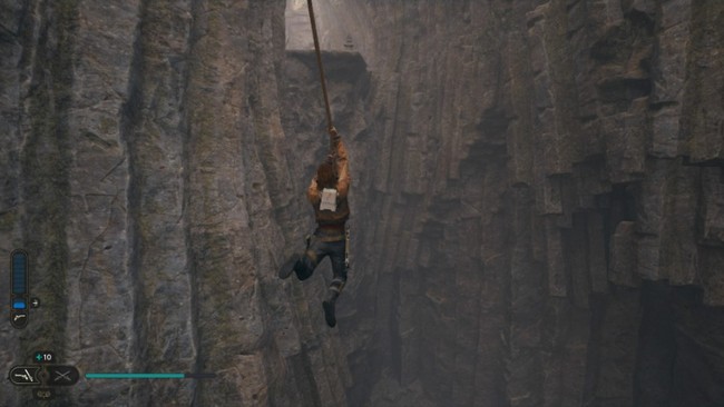 Continuez à suivre le chemin de droite, sautez au mur, puis attrapez la corde au bout du passage avec le bouton L2 (LT).