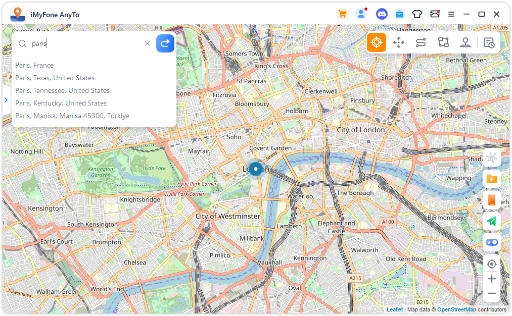 • En utilisant des outils d’usurpation de GPS. C’est l’un des moyens les plus efficaces pour falsifier votre position sur la carte Snapchat. Ces outils vous permettent de changer la position GPS de votre appareil Android ou iOS pour n’importe quel endroit dans le monde, et donc de tromper Snapchat en affichant votre fausse position sur la carte. Il existe de nombreux outils d’usurpation de localisation GPS sur le marché, mais nous ne recommandons ici que le plus populaire d’entre eux, nommé AnyTo.