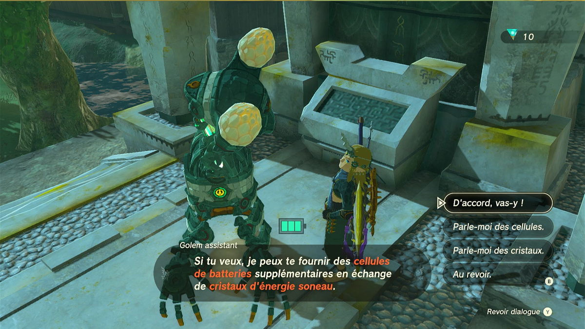 Pour créer une nouvelle cellule de batterie, il vous faudra 100 cristaux d’énergie Soneau : Veuillez se rendre chez un Golem assistant pour faire l’échange.