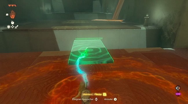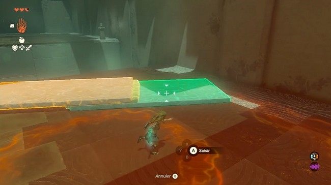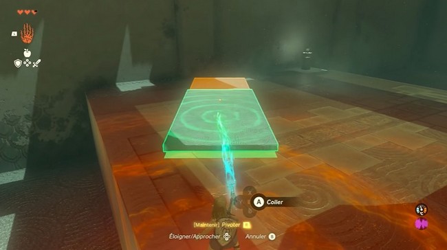 Pour le dernier défi de ce sanctuaire, vous devez d’abord placer la planche sur le sol. Prenez ensuite l’un des crochets et fixez-le à la planche à l’aide d’Emprise.