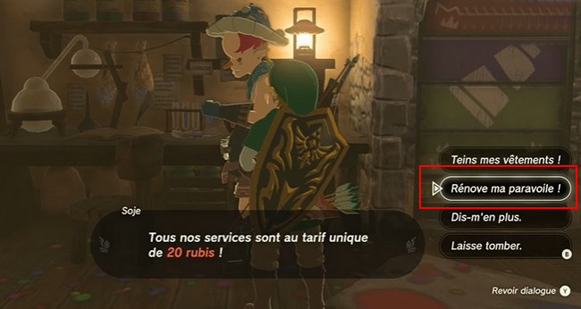 Il vous proposera des options de dialogue : « Teins mes vêtements » ou « rénove ma Paravoile ». Vous devez choisir la deuxième, c’est-à-dire de changer l’apparence de votre paravoile.