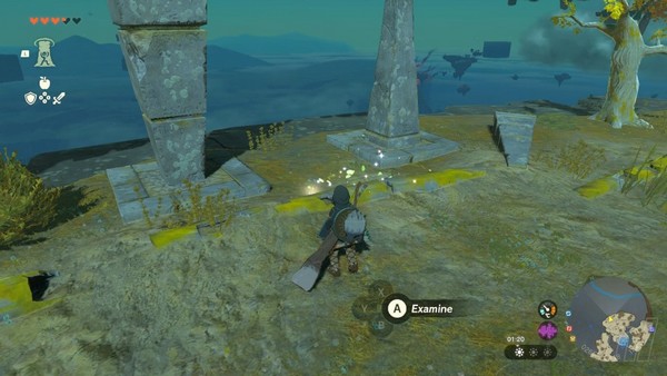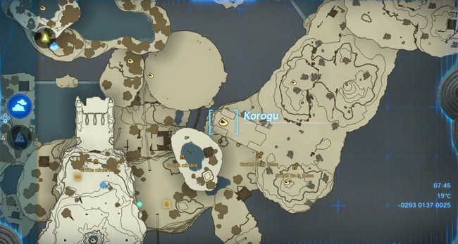 - Allez au endroit sur l’image ci-dessous pour trouver un bout de sol cassé. Fusionnez une arme avec un rocher en utilisant Amalgame, et faites ensuite plusieurs coups en direction du sol. Après avoir détruit le rocher, laissez-vous tomber. Une cible apparaîtra (vous le saurez en entendant un bruit). Vous explosez la cible avec une flèche pour obtenir la noix Korogu.