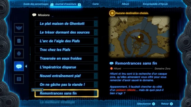 De retour au Domaine Zora, vous trouverez Hifumi et Imu, qui se plaignent de ne pas pouvoir trouver le casque Zora. En les écoutant, vous lancez la mission « Remontrance sans fin ».