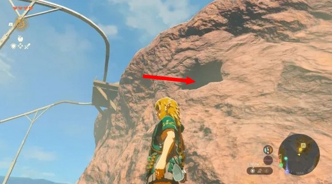 Pour débloquer la porte bloquée dans la maison de Grosaillieh, Link doit sauter de la falaise derrière la maison et planer jusqu’à l’entrée d’une grotte.