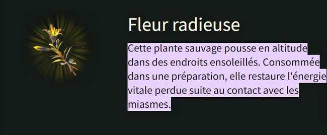 Description officielle : « Cette plante sauvage pousse en altitude dans des endroits ensoleillés. Consommée dans une préparation, elle restaure l’énergie vitale perdue suite au contacte avec les miasmes. »