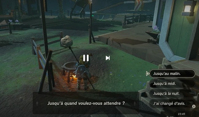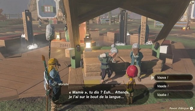 Après avoir discuté avec elle, suivez-la. Elle se rend chez sa grand-mère à la fontaine au centre de la ville. C’est là que se déroule une petite scène avec les personnes âgées et que nous allons apprendre le langage Gerudo !