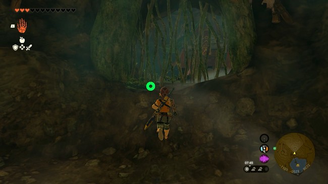 Il y aura une autre plateforme à gauche où vous pourrez récupérer de l’endurance si nécessaire. Continuez à grimper pour atteindre une pièce où plusieurs racines d’arbres poussent à travers le sol et le plafond. Regardez devant vous pour trouver une autre entrée bloquée par des lianes. Coupez-les.