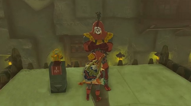 Étape 3 : En grimpant à l’échelle, vous allez atteindre un officier Yiga organisant des entraînements au combat. Repérez les décorations du portail pour repérer le couloir.