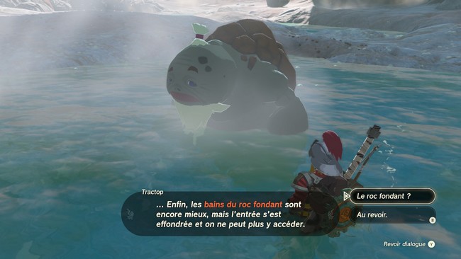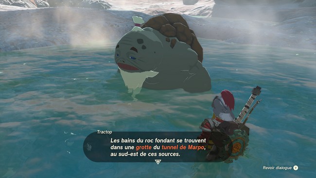Dirigez-vous au sud de la ville jusqu’aux sources chaudes Gorons. En arrivant au bon endroit, vous trouverez le Goron dans l’une des sources chaudes. Parlez-lui, et vous apprendrez l’emplacement de la source d’eau chaude secrète. Les bains du roc fondant se trouvent dans une grotte dans le tunnel de Marpo.
