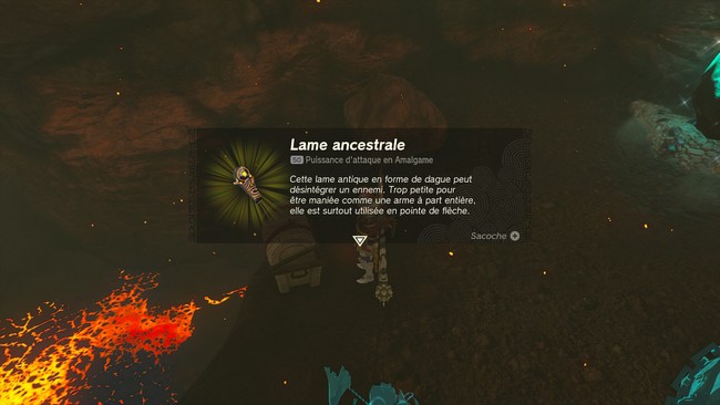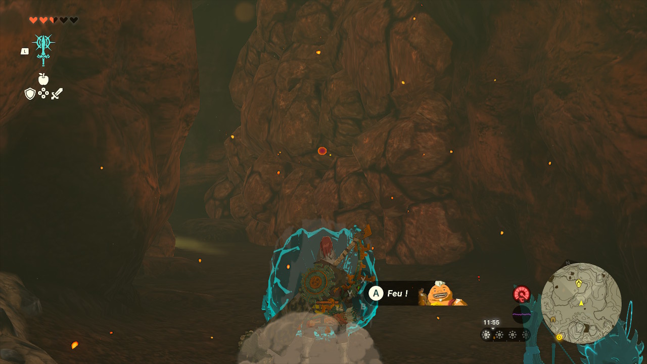 Escaladez les murs pour atteindre le haut du rebord où se trouve un coffre contenant une Lame ancestrale. Redescendez et partez vers la droite pour détruire un autre amas de roches grâce à Yunobo.