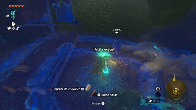 Il y a des Bâtons solides et des Feuilles de Korogu (utiliser Amalgame) à proximité que vous pouvez utiliser pour faire avancer le radeau, alors parlez à Mabbou pour qu’il vous rejoigne sur le radeau.