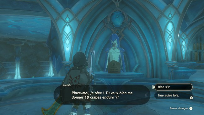Il vous demandera 10 Crabes enduro, que vous trouverez dans le Domaine Zora et dans les Marécages de Lanelle.