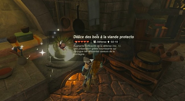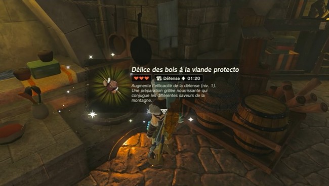 Par exemple, si vous préparez un délice des bois à la viande protecto normale, vous aurez 3 cœurs et 1.20 de défense.