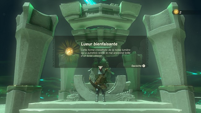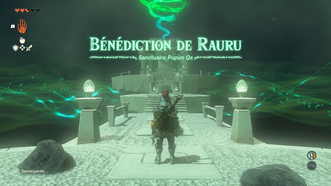Activez la porte pour ouvrir le Sanctuaire Pupun Qe, dirigez-vous à l’intérieur pour ouvrir le coffre contenant l‘Épée de sonium surpuissante, puis montez sur l’autel pour recevoir votre Lueur bienfaisante.
