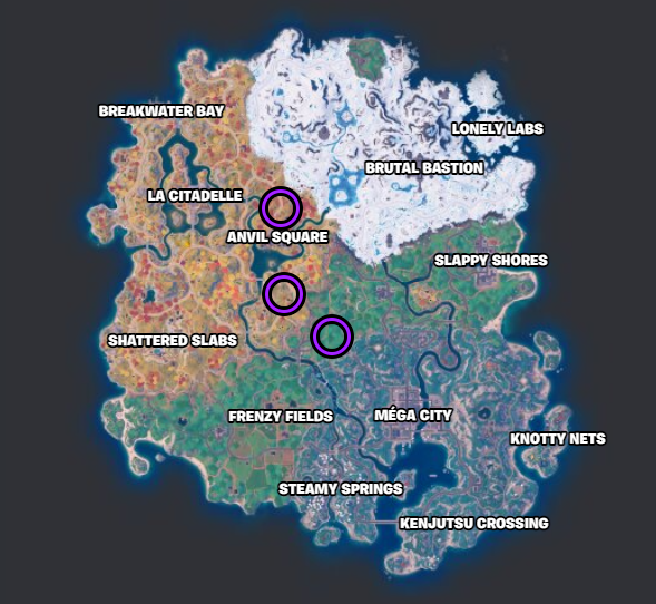 Les camps de fouille sont tous relativement proches les uns des autres, de sorte que les joueurs qui veulent terminer la quête en un seul match devraient pouvoir le faire tant qu’ils ne tombent pas sur des joueurs agressifs. Voici où les joueurs peuvent trouver les camps de fouille dans Fortnite :